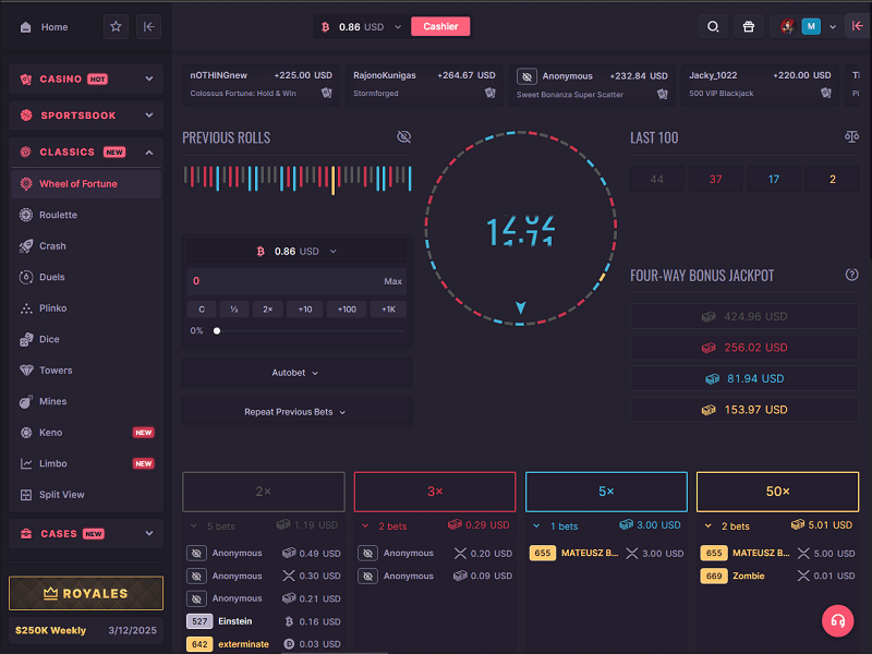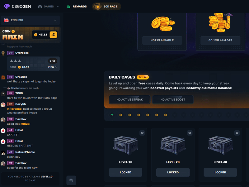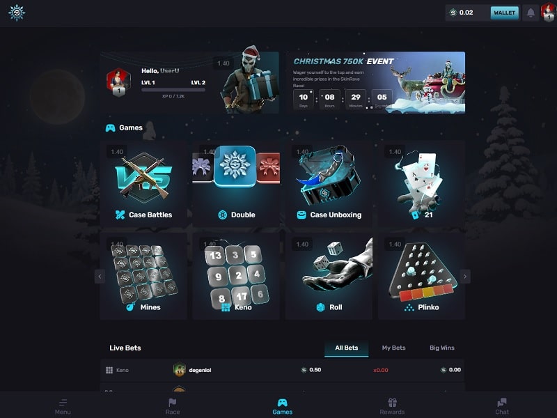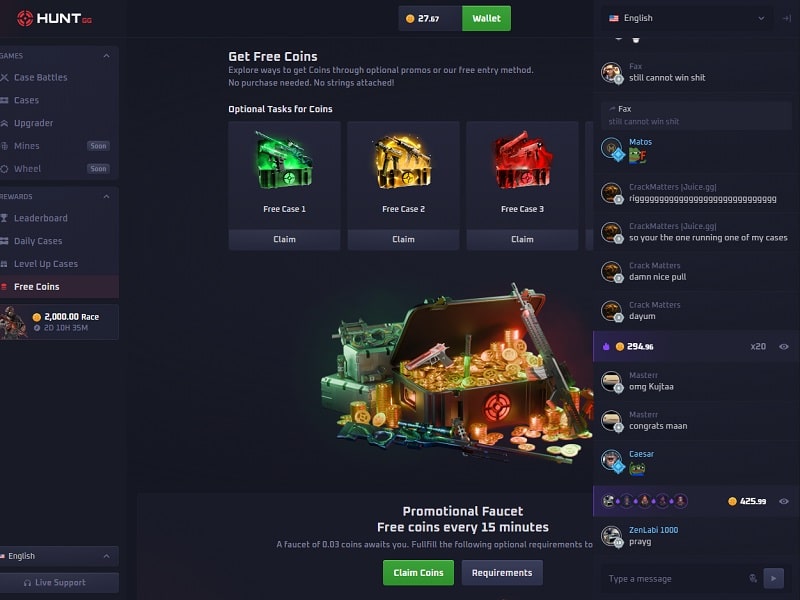 CS2 skins casino sites with other funding options such as crypto and fiat currencies and free daily coins or cases (most)*.
